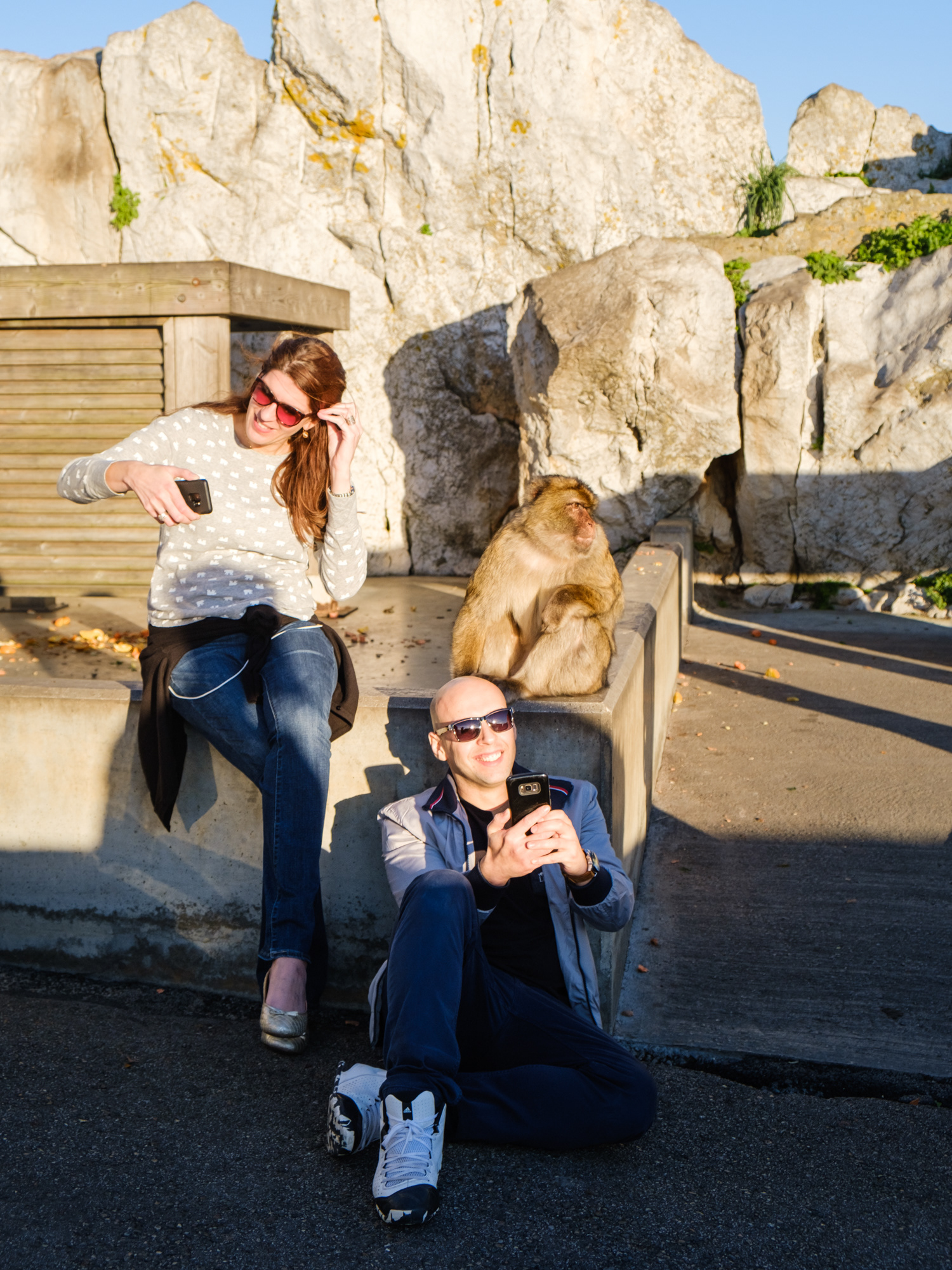 Touristen machen Selfies mit einem Berberaffen. Die Makaken in Gibraltar sind die einzige wilde Affenpopulation in Europa und vielleicht die größte Touristenattraktion der Halbinsel. Jährlich besuchen mehrere Millionen Touristen den sogenannten „Monkey Rock“. Die meisten kommen über die Landgrenze. Eine Legende besagt, dass die Briten Gibraltar verlassen werden, wenn die Berberaffen verschwinden.
