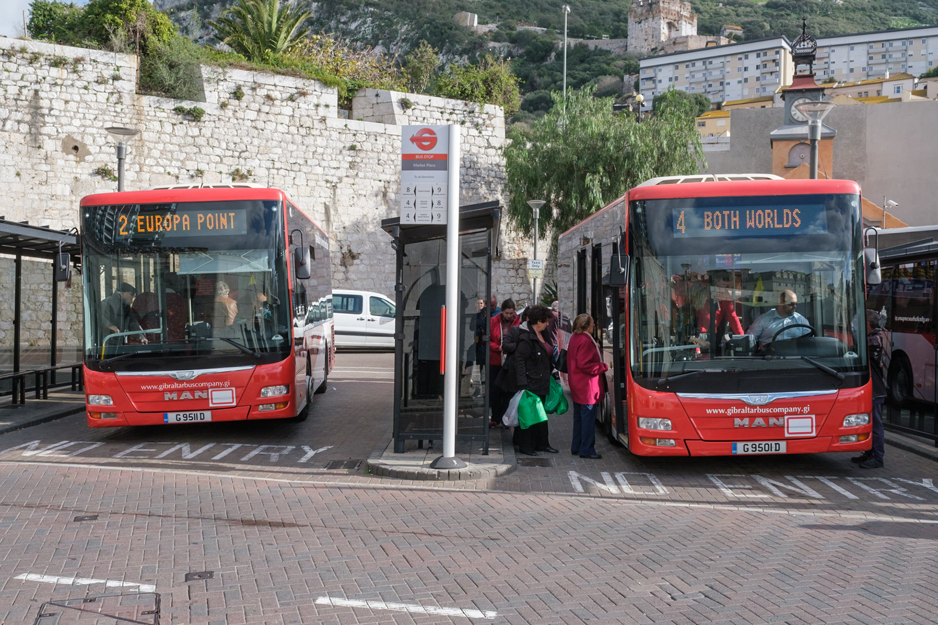 Busse bringen Menschen vom Stadtzentrum zum Aussichtspunkt „Europa Point“ und zum Ferienresort „Both Worlds“ an der Ostseite der Halbinsel. Der öffentliche Nahverkehr in Gibraltar besteht hauptsächlich aus Bussen.