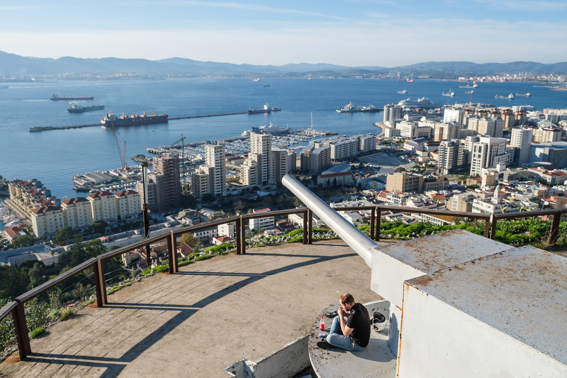 Ein junger Engländer raucht während seiner Mittagspause. Vom ehemaligen militärischen Standort Devil's Gap Battery hat man einen guten Blick auf die Bucht von Gibraltar.