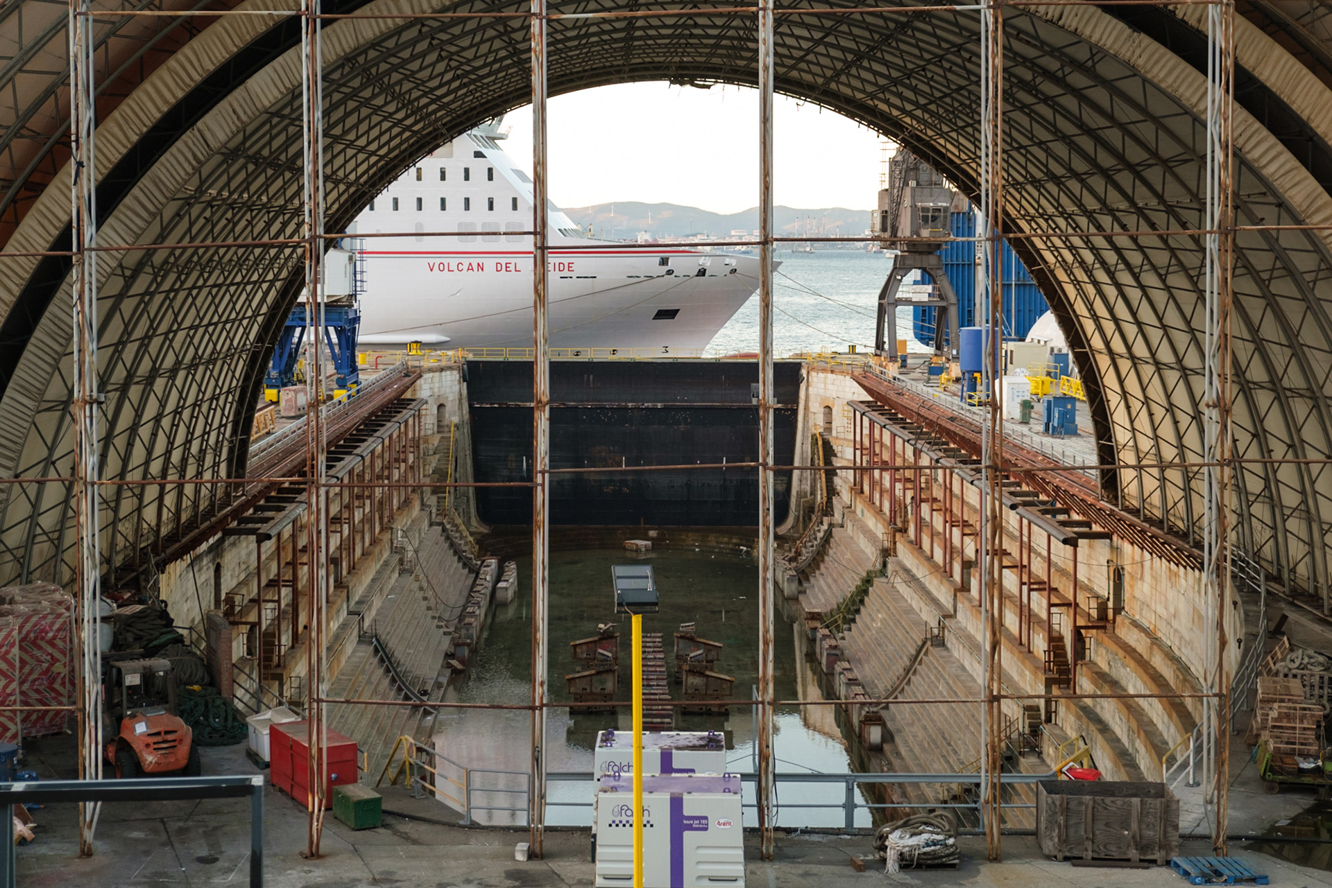 Die Fähre „Volcano del Teide“ mit Platz für 1500 Passagiere liegt vor der Werft im Hafen von Gibraltar. Im Jahr 2018 besuchten etwa 400.000 Kreuzfahrttouristen die Halbinsel.