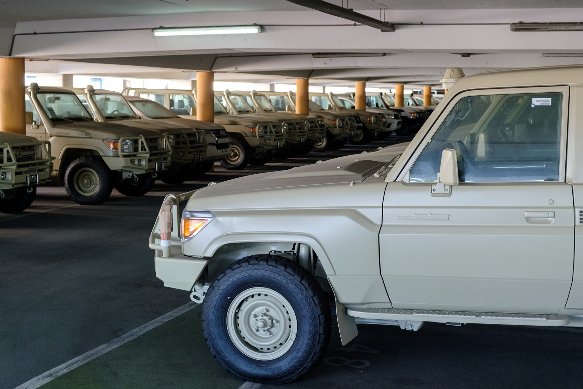 Dutzende von Toyota Landcruisern sind auf einem öffentlichen Parkplatz in Gibraltar geparkt. Toyota exportiert die 4x4-Fahrzeuge von Gibraltar in zahlreiche afrikanische Länder. Zu den Kunden gehören unter anderem die UNO, Hilfs- und Regierungsorganisationen. Die steuerlichen Vorteile im britischen Überseegebiet ziehen viele internationale Unternehmen an. Die spanische Regierung versucht, die Steuervergünstigungen in Gibraltar abzuschaffen.