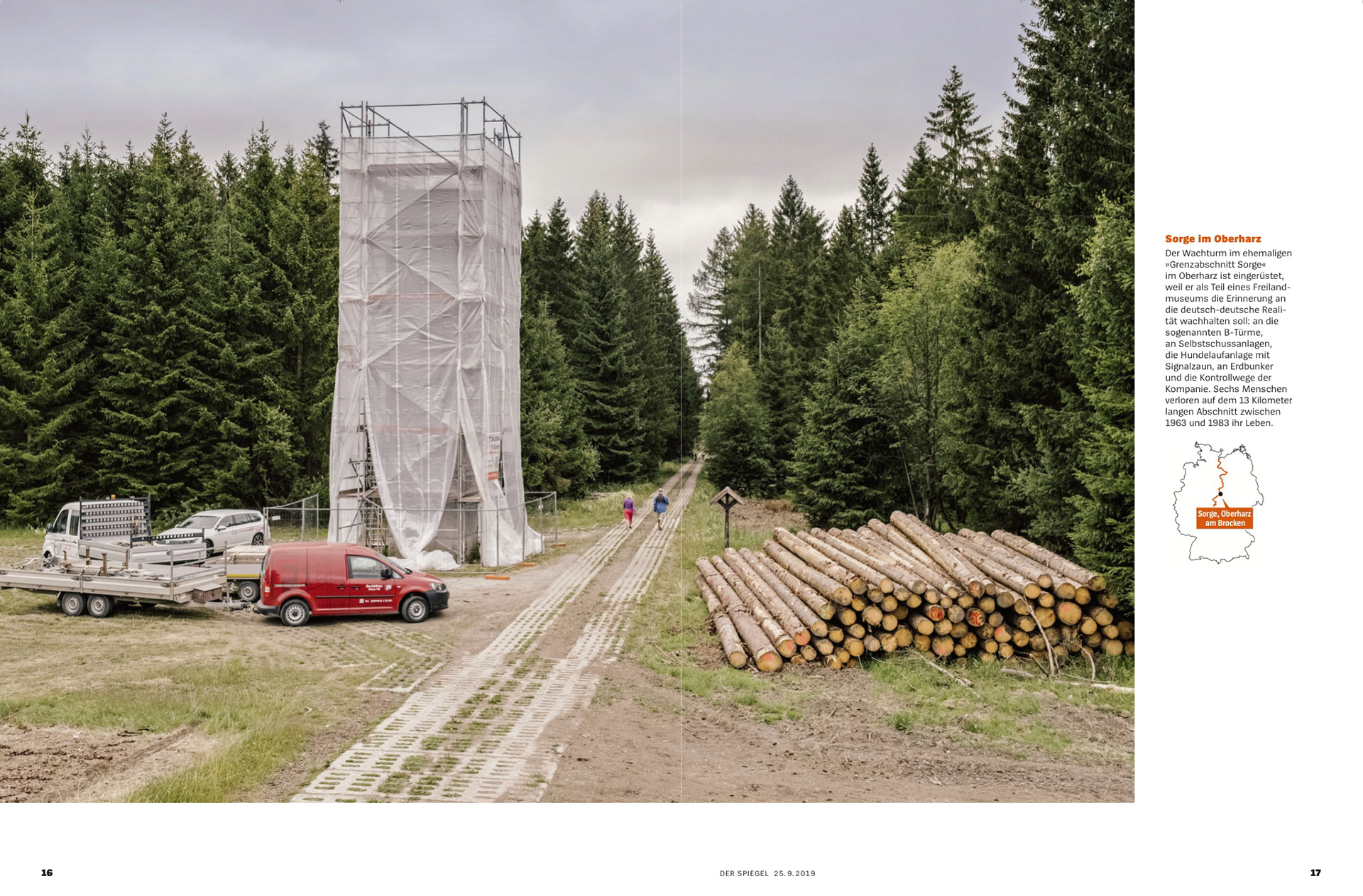 Der Wachturm im Grenzmuseum Sorge im Harz wird für Renovierungsarbeiten abgedeckt. Das Grenzmuseum ist Teil des „Grünen Bandes“, einem europaweiten Naturschutzprojekt, das die Artenvielfalt und Lebensräume entlang der ehemaligen innerdeutschen Grenze bewahren soll. Der Grenzstreifen ist zu einem Rückzugsort für mehr als 1.200 seltene und bedrohte Pflanzen- und Tierarten geworden.