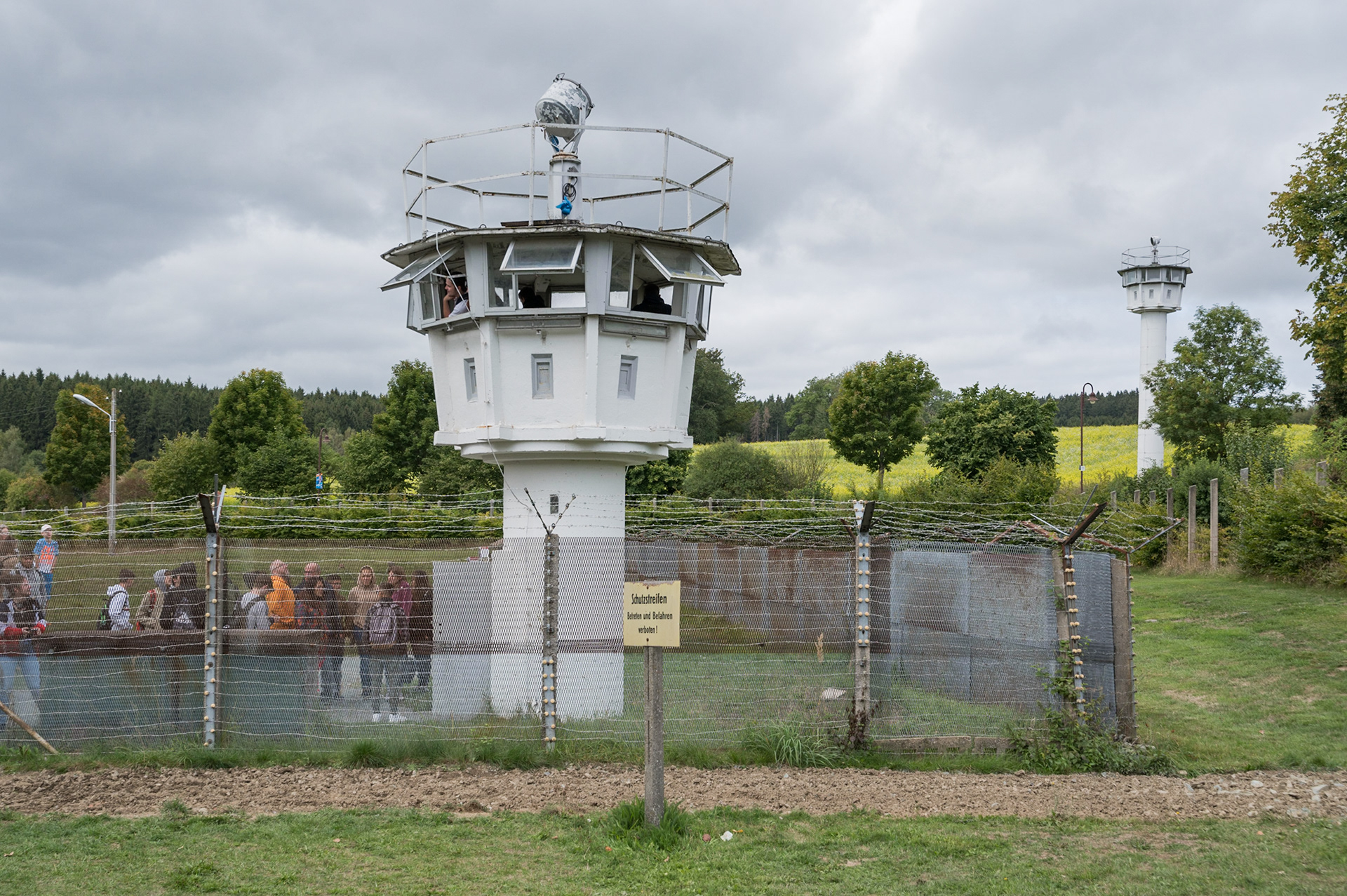 Eine Schulklasse besucht den Grenzsignalzaun und die Beobachtungstürme des Mödlareuth-Memorials. Das geteilte Dorf war auf der einen Seite ein Sperrgebiet und auf der anderen ein Ziel zahlreicher Besucher. Hier war es verboten, von Ost nach West zu winken oder zu grüßen.