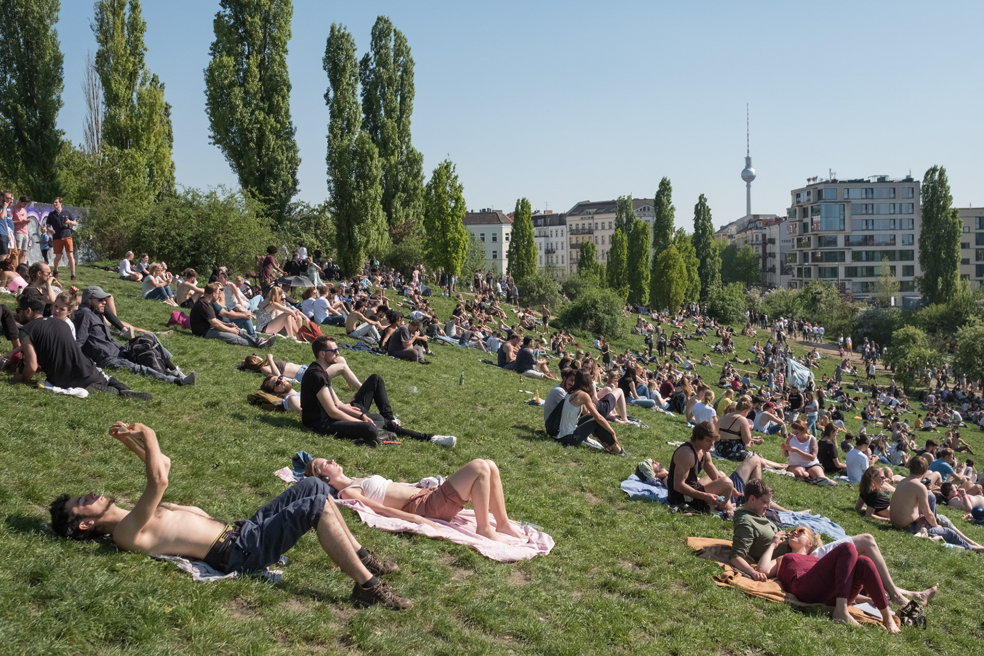 Hunderte von Besuchern entspannen im Mauerpark, dem ehemaligen Todesstreifen, der heute als Erholungsort und kulturelles Zentrum dient.