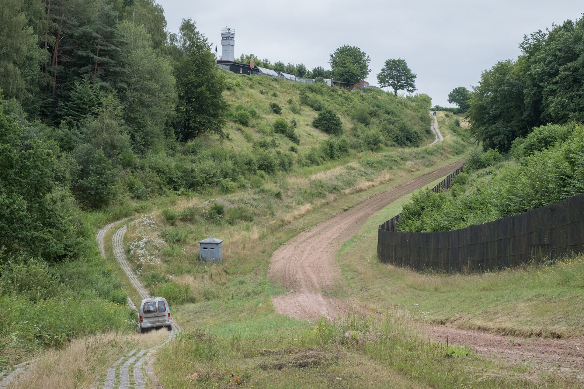 Die Ingenieure des Grenzmuseums Schifflersgrund fahren entlang des Patrouillenwegs der ehemaligen Grenze mit Grenzzaun, Kontrollstreifen und Wachturm in Asbach-Sickenberg.