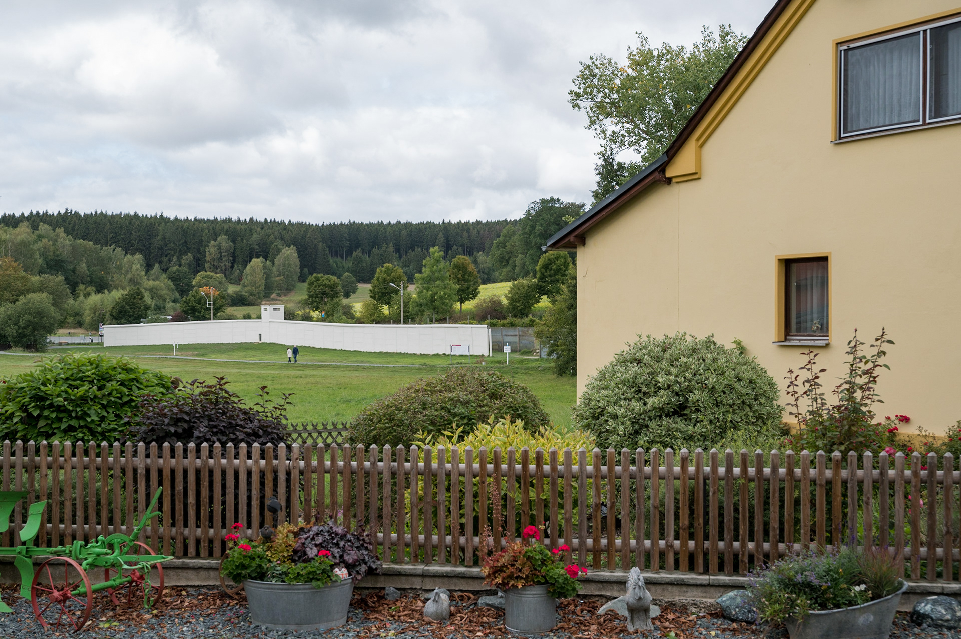 Ein Wohnhaus mit Vorgarten im Westen des 40-Einwohner-Dorfes Mödlareuth. Im Hintergrund die Grenzmauer der DDR. Die Amerikaner nannten es „Klein-Berlin“, dieses abgelegene Dorf, das wie sein großes Pendant zu einem Symbol der deutschen Teilung wurde.
