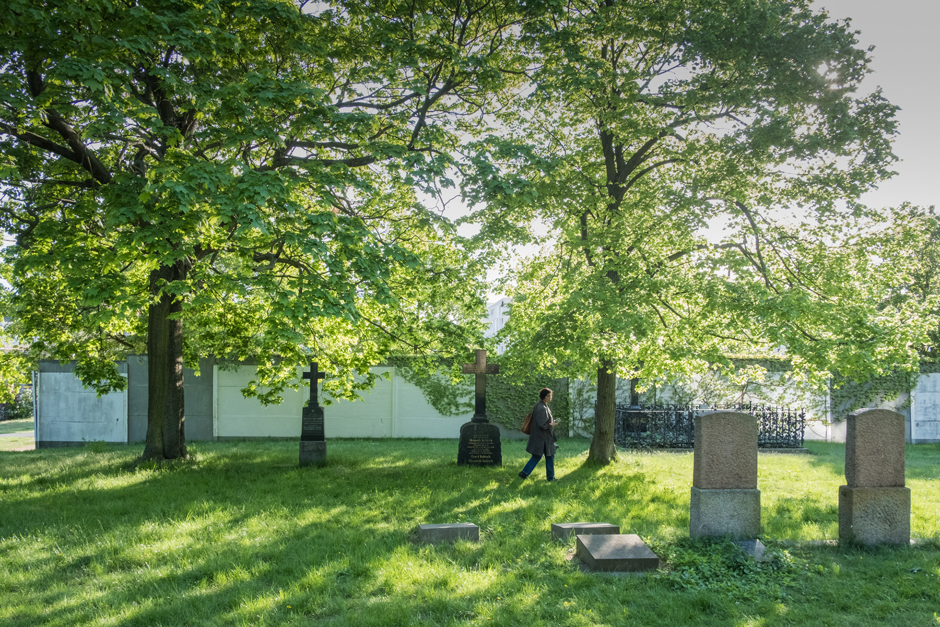 Eine Frau geht durch den Invalidenfriedhof in Mitte. Der Friedhof ist noch immer durch die Hinterlandmauer geteilt.