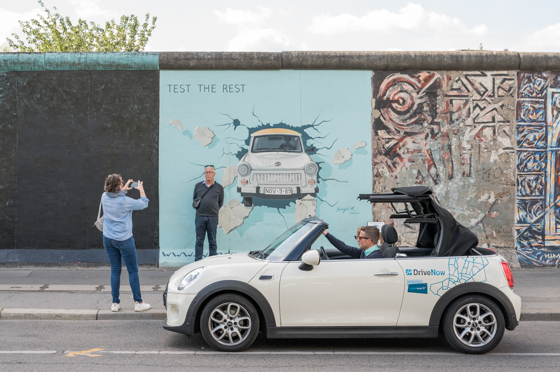 Ein Mini-Cabrio steht an der Eastside Gallery vor dem Wandgemälde "Test the Rest" von Birgit Kinder.