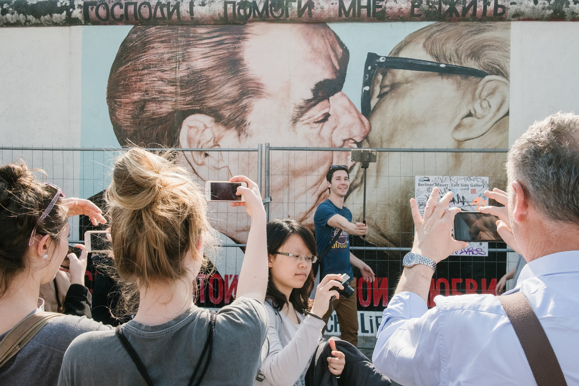 Touristen an der East Side Gallery vor dem Gemälde des „Bruderkusses“ zwischen Leonid Breschnew und Erich Honecker des russischen Malers Dmitri Vrubel. Für Renovierungsarbeiten wurde die Berliner Mauer mit einem Bauzaun gesichert.