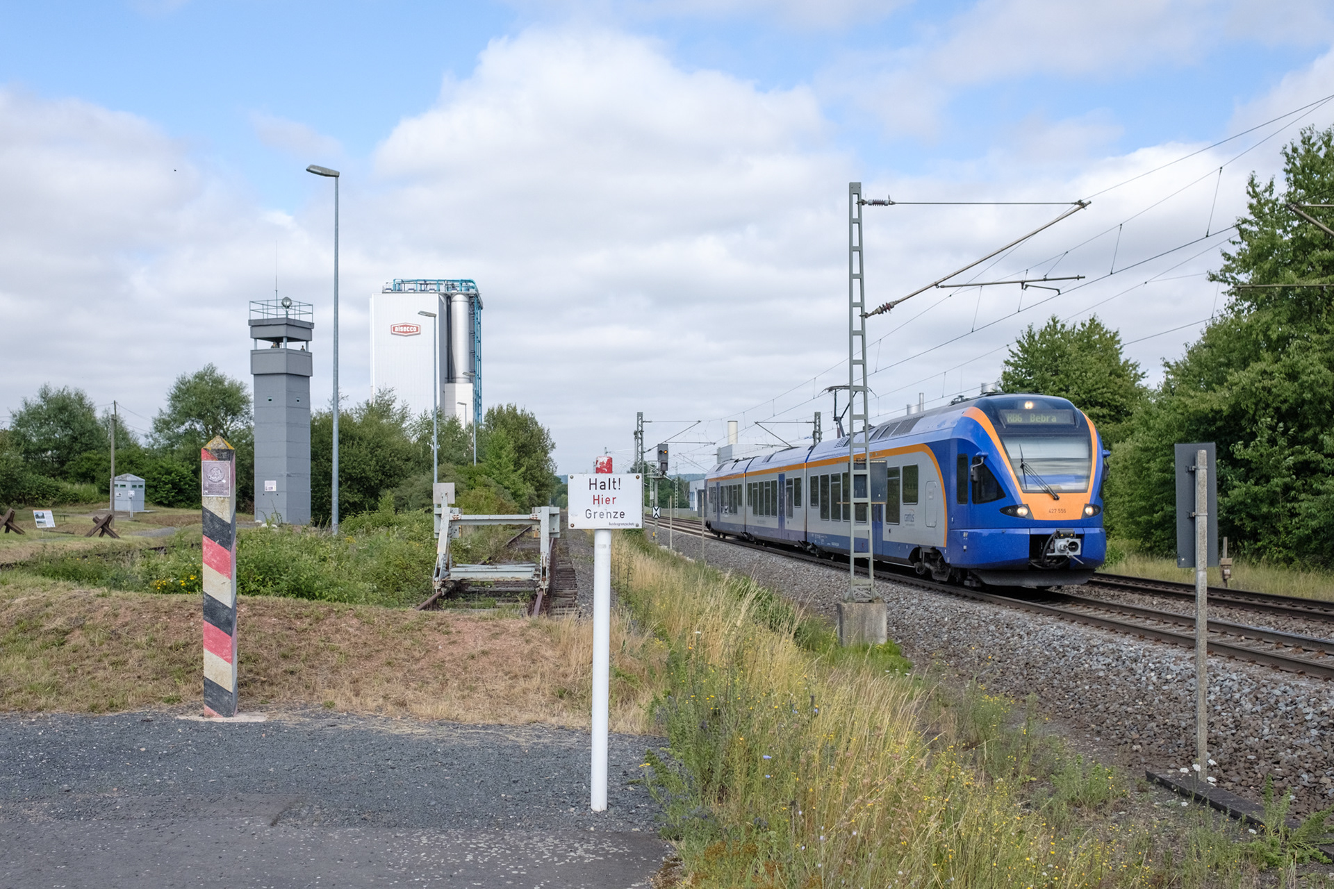 Wachturm, gesperrter Bahnlinie und Panzerbarrikaden neben der neuen Bahnlinie in Gerstungen.