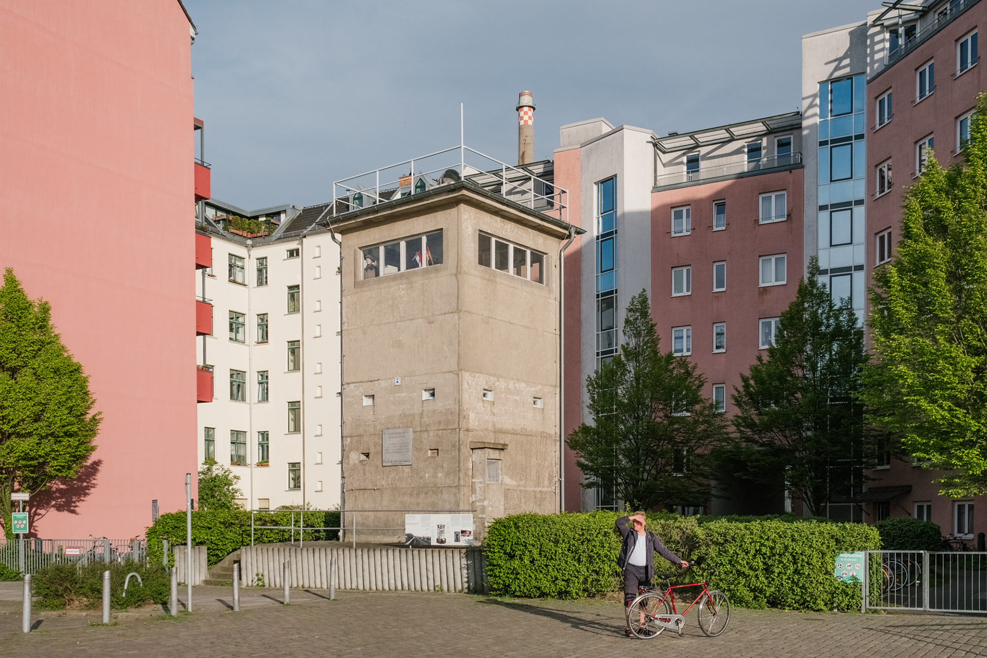 Neubauten umgeben den ehemaligen Wachturm in Berlin. Heute dient der Wachturm als Gedenkstätte für Günter Litfin, das erste Opfer, das durch Schusswaffen an der Berliner Mauer ums Leben kam.
