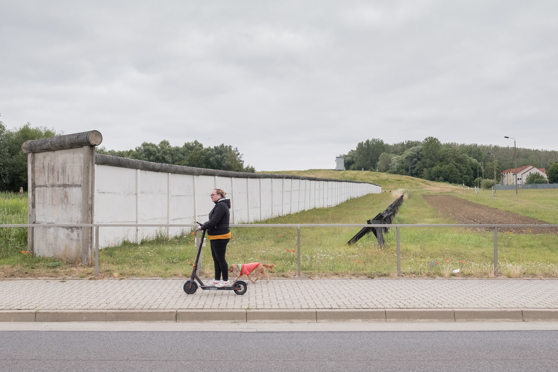 Eine Frau mit einem E-Scooter passiert die Grenzanlage der DDR mit Mauer, Metallzäunen, Signaldrähten, Minenfeldern und einem Wachturm des Grenzdenkmals Hötensleben. Das Dorf lag direkt an der Grenze und war daher besonders stark gesichert. Heute steht der 350 Meter lange Abschnitt der Grenze unter Denkmalschutz.