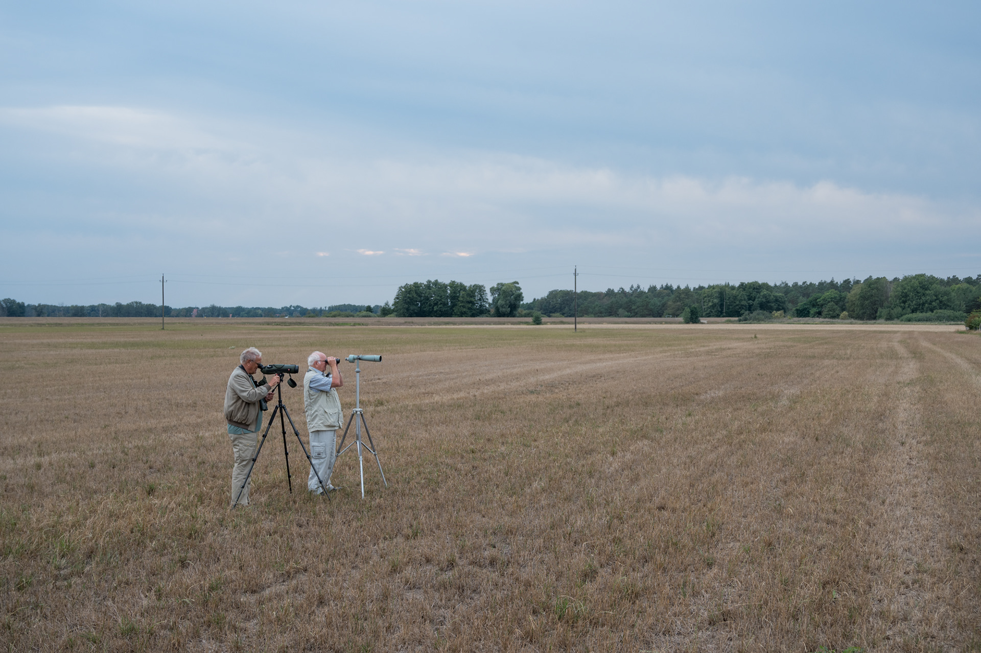 Die Ornithologen Horst Wegener und Achim Bruch beobachten einen Rotfußfalke im ehemaligen Todesstreifen.