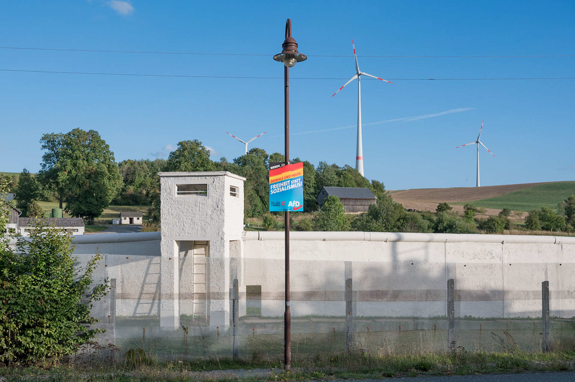 Ein Wahlplakat der rechtspopulistischen AfD hängt an der Ostseite des Dorfes Mödlareuth. Mehr als 37 Jahre lang teilte die Grenze das kleine Dorf „Klein-Berlin“ und riss Freunde und Familien auseinander.